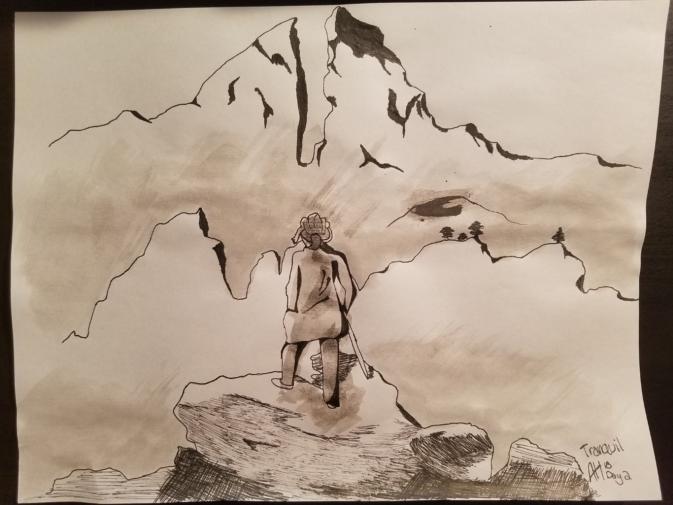 In pencil, I sketched the foreground rocks and some of the background mountains from the painting, as well as the Wanderer with (sort of) Link’s hair and the Dueling Peaks. Then I tried my best to ink the sketch with an inking pen, but I’m not crazy about the quality. I used watered down ink with a brush to try to make a sea of fog, though I really just made the paper lumpy and saturated.