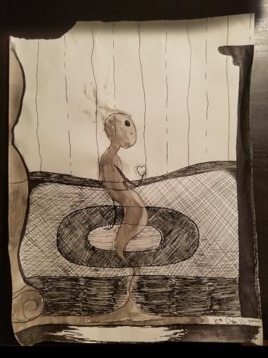 I Googled “face punch” until I found a good spit take, “falcon” until I found a suitable falcon pose, and “boxing gloves” until I found a good model. Using these images as reference, I synthesized them into a pencil sketch. I tried my best to do shading using the inking pen (which was VERY different then pencil shading), and I flicked the inking pen to get the spattered drool effect. I didn’t give the guy a body because my reference cut off and I didn’t feel like trying to draw and shade it freehand.