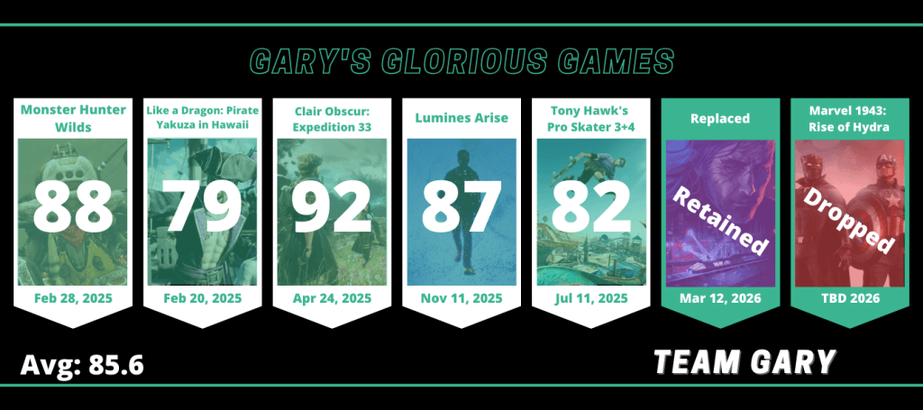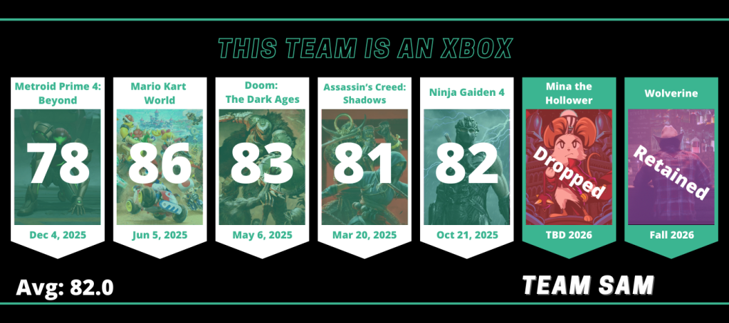 - Scoring: Games are scored based on their Metacritic score. If a game has multiple scores on the aggregator site (e.g., a multiplatform game), we default to the platform with the highest sample size of reviews. Once a game begins receiving review scores, it is locked into place on a person’s team unless it is formally dropped during our annual Waiver Wire (see below). If a game doesn’t release but is left in an active slot, it counts as a 0. If a game releases but doesn’t garner enough reviews on Metacritic, it is counted as a 0. (Please note: As of writing, we don’t submit to Metacritic. We do submit to OpenCritic, however, which is why we don’t base scores off of that aggregator.)